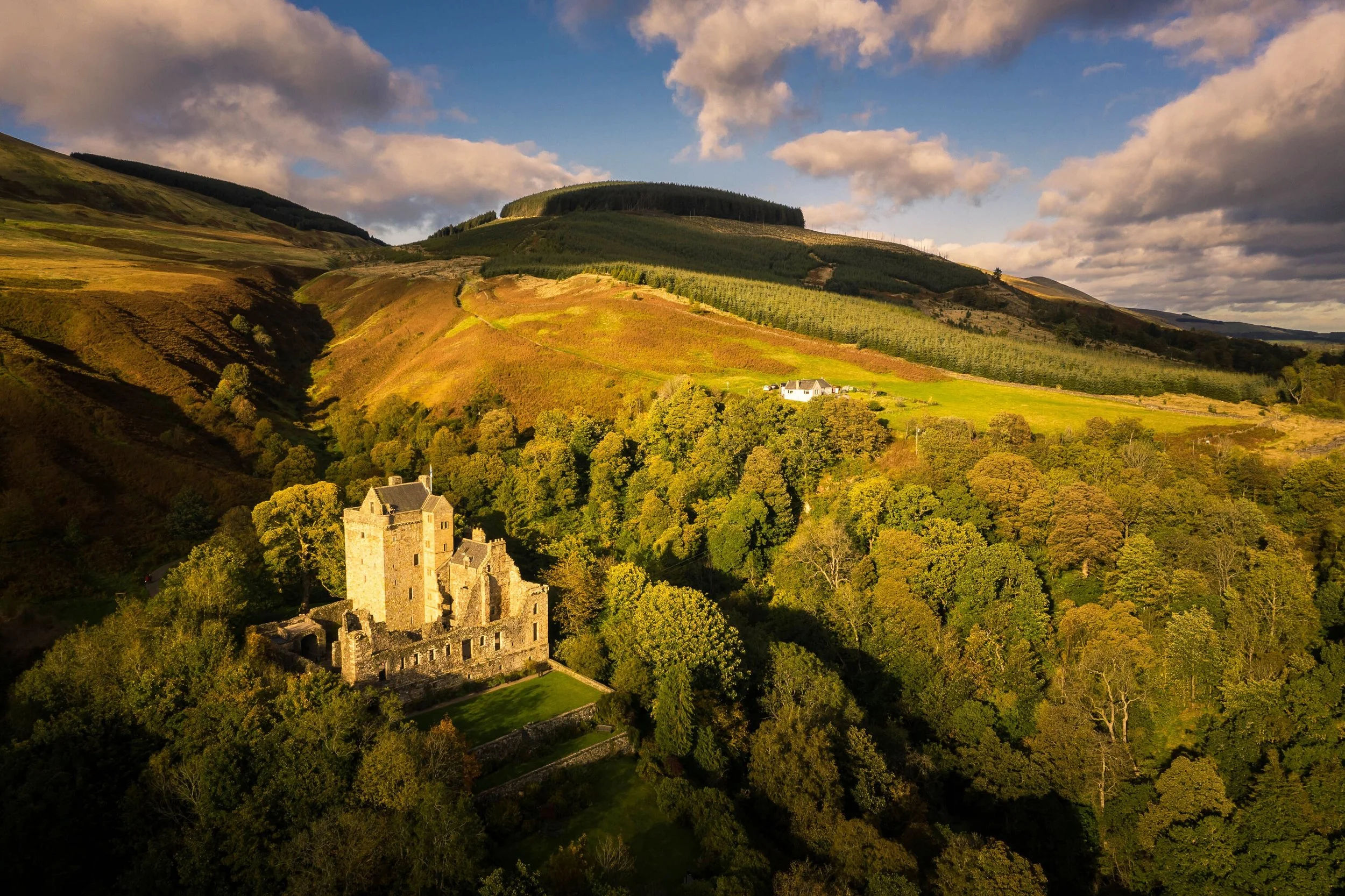 Castle Campbell sits high above Dollar Glen, surrounded by steep ravines, cascading streams, and rich green woodland. The approach alone feels cinematic — a winding path leads through emerald glen scenery, crossing wooden bridges and passing waterfalls before the castle appears dramatically perched between two deep valleys. Known historically as the “Castle of Gloom,” its nickname feels ironic today; the setting is anything but gloomy.